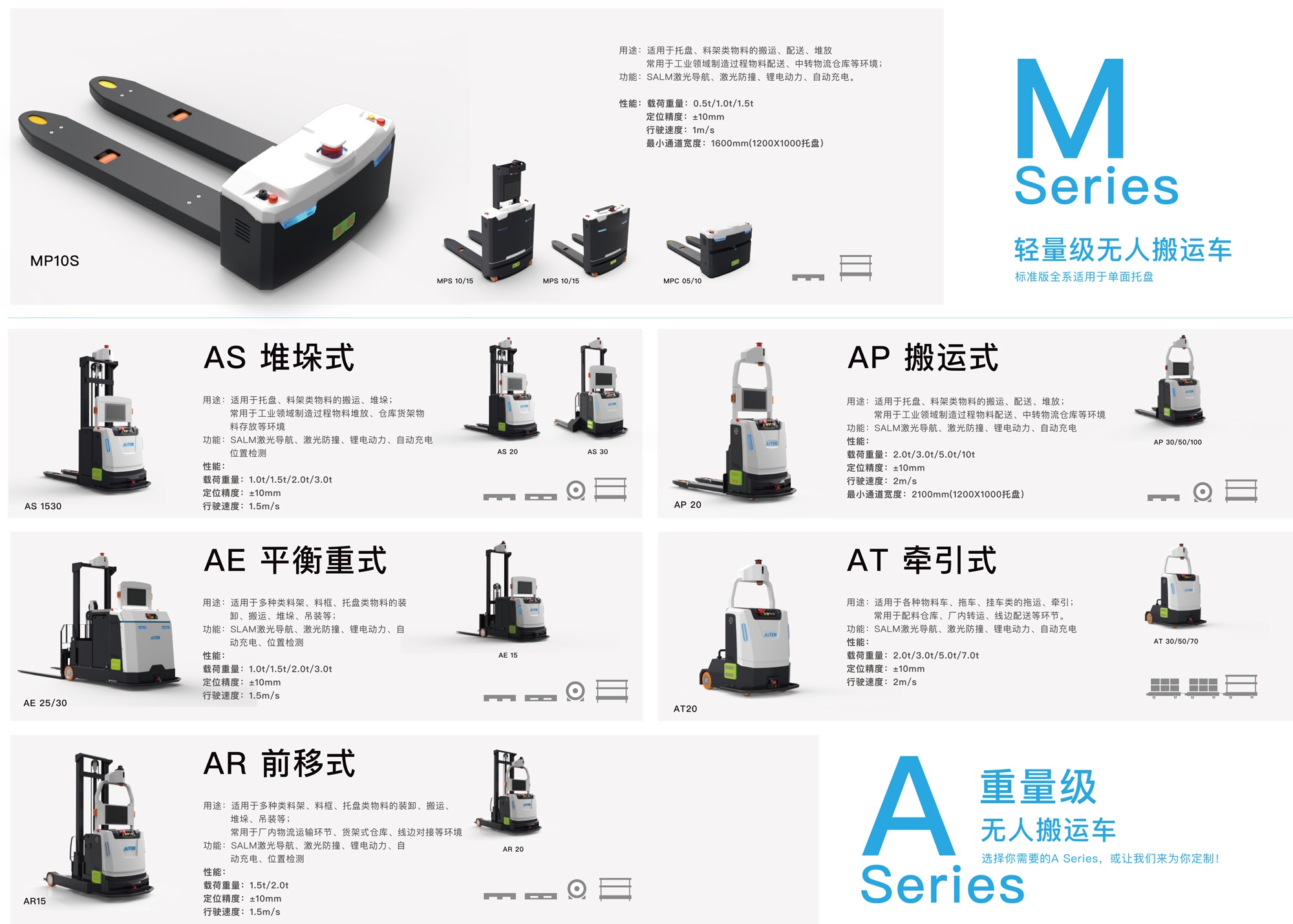 其中,海豚之星AGV无人叉车在行业内的知名度虽小,但其主打产品M系列小海豚——MP10S受欢迎程度只增不减,其使用的导航方式有磁导航、激光导航等,可以在狭窄的通道里原地360°自由转向、行驶,车身配有手动操作控制器,既可以人工操作行驶,也可以根据计算机软件控制运行路径,操作方便、简单,且外表美观。海豚之星AGV无人叉车的A系列产品亦是,拥有激光导航的动力模块,加上定制化执行机构,高度集成化的设计布局,具有安装维护简单、快捷、安全、可靠性高等优势。